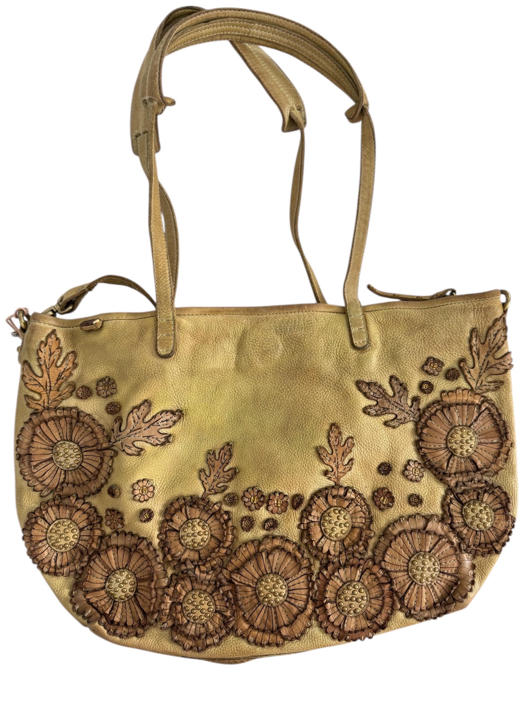 - Dip dyed leather tote with handmade daisy applique flowers in beautiful soft moss colour
